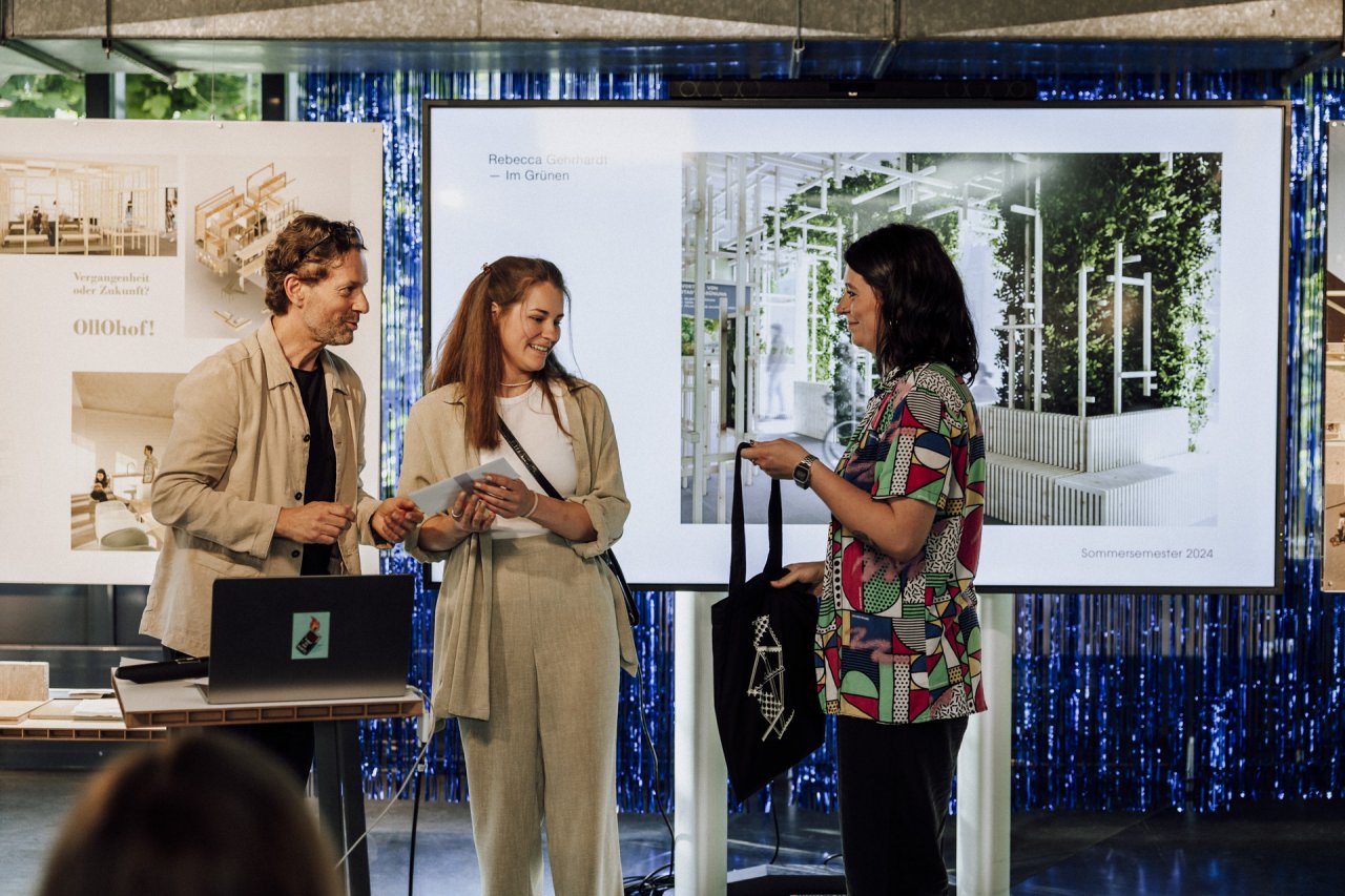 Für die Masterthesen suchen sich die Absolvent:innen ein eigenes Thema der „Kommunikation im Raum“. Die drei Masterstudierenden haben unterschiedliche Backgrounds; Sie kommen aus dem Mediendesign, dem Kommunikationsdesign und der Innenarchitektur. So gestalten sie auch ihre Räume aus unterschiedlichen Perspektiven. Die Interdisziplinarität ist Programm im Studiengang und prägt auch die Abschlussarbeiten, die mal aus dem forschenden Interesse und mal aus dem praxisbezogenen Anwendungsbereich kommen.