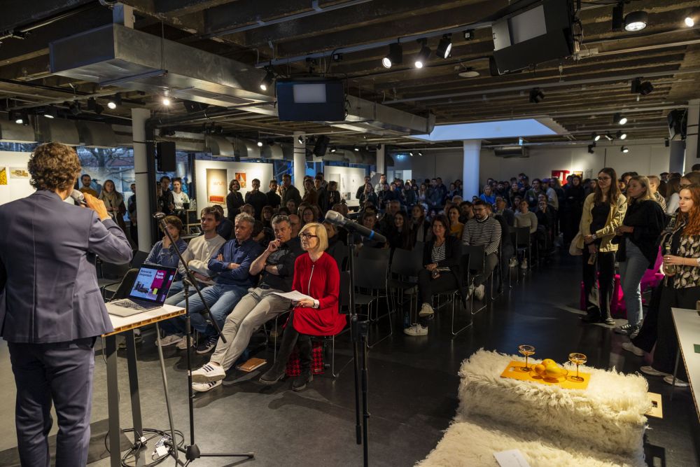 Wie üblich wurde die Ausstellung mit einer Vernissage eingeleitet. Teil davon waren unter anderem Kurzpräsentationen der ausstellenden Studierenden, der Kooperationspartner Vepa und Plantics und unserer Präsidentin Prof. Dr. Susanne Weissman. An diesem Abend wurde natürlich auch auf die gelungene Zusammenarbeit angestoßen.
