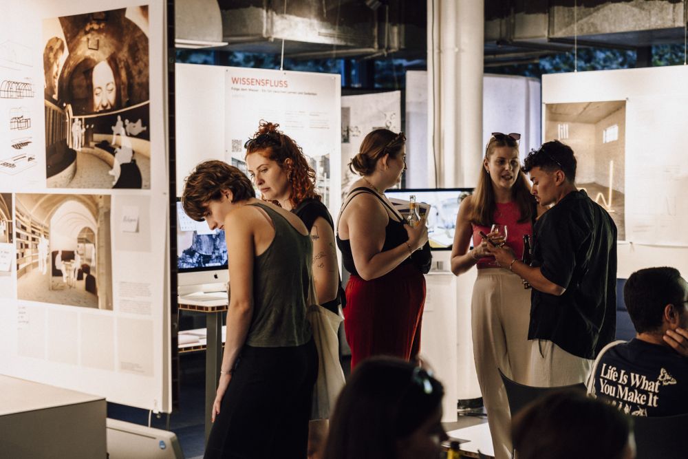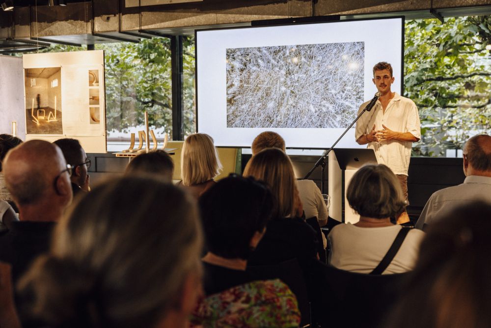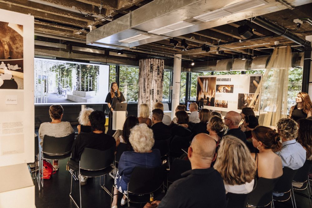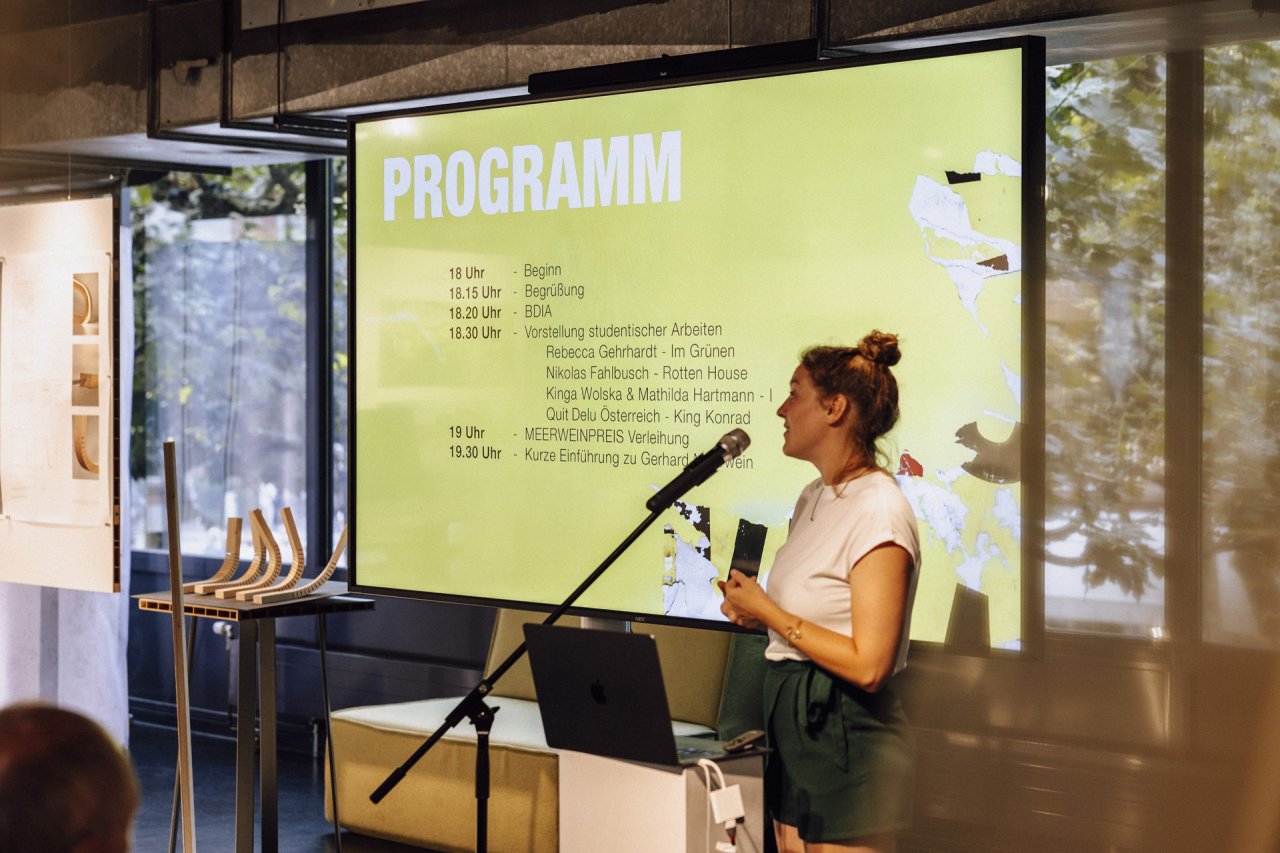 Katharina Kasinger leitete gemeinsam mit Prof. Anja Soeder an diesem Abend wieder in die Vernissage ein. Darauf folgten studentische Projekt-Präsentationen der ausgestellten Entwürfe, die Verleihung der Auszeichnung und Anerkennung des bdia (Bund deutscher Innenarchitekt:innen), sowie die Verleihung des Meerweinpreises 2023.