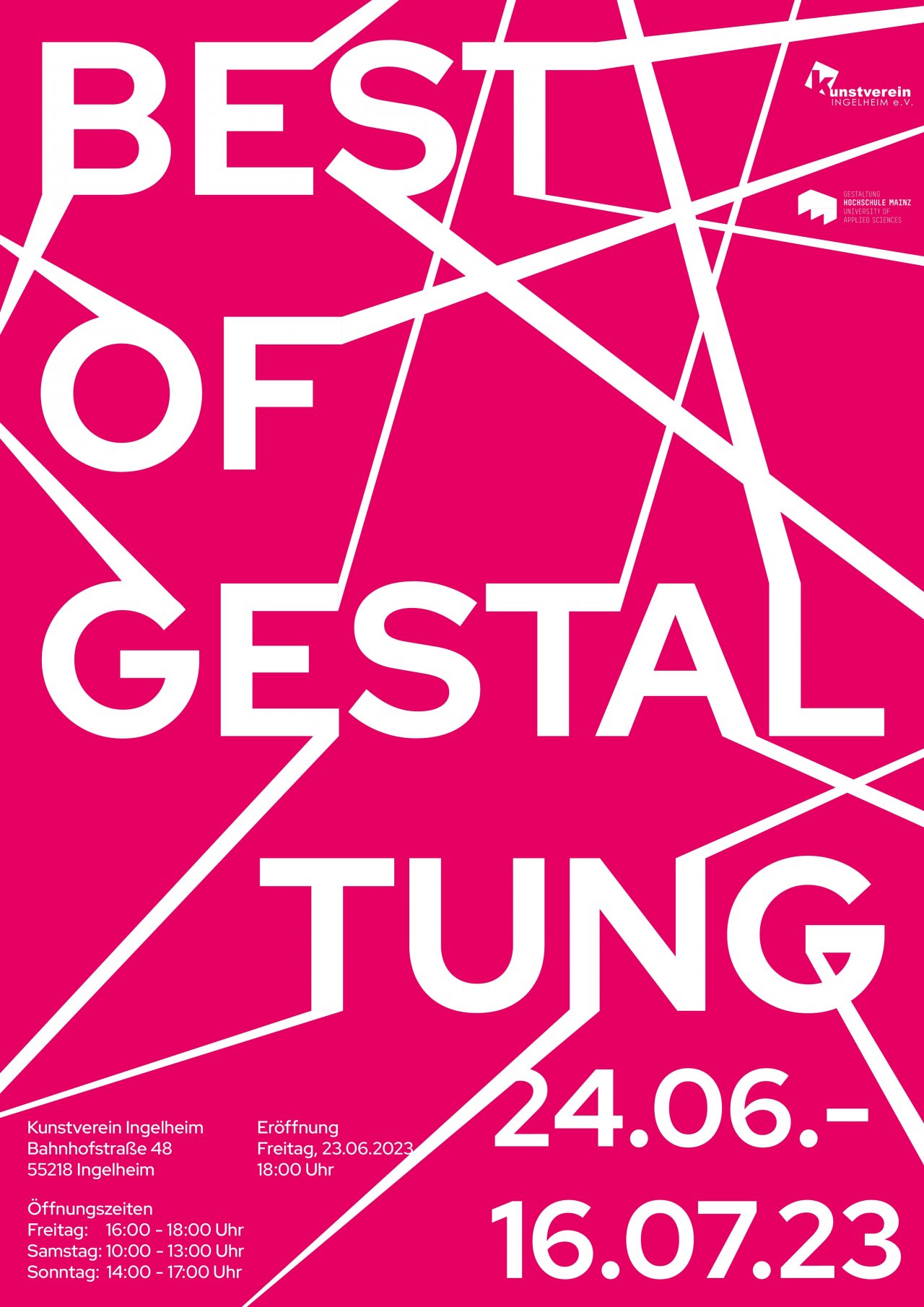 Der Fachbereich Gestaltung zeigte im Sommer 2023 aktuelle Ergebnisse der Gestaltungslehre der Hochschule Mainz im Kunstverein Ingelheim. Die große Bandbreite und hohe Qualität der studentischen Arbeiten der drei Fachrichtungen Innenarchitektur, Kommunikationsdesign und Mediendesign konnte erstmals gemeinsam in einer öffentlichen Kunst-Institution präsentiert werden.