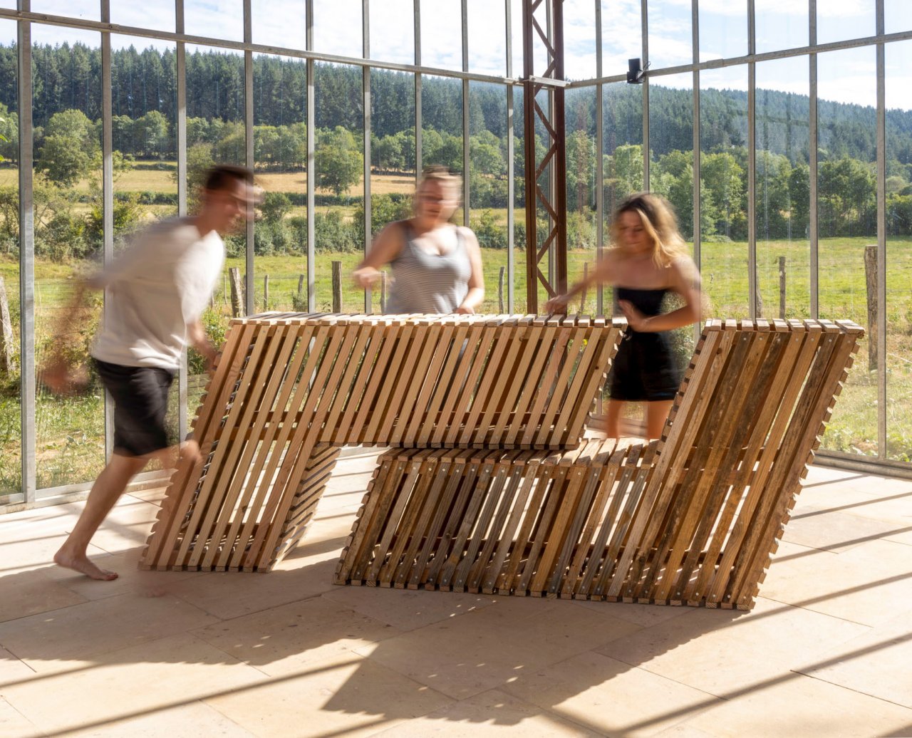 Holzreste aus Tobias‘ Sägemühle dienten auch diesmal als nachhaltiges Baumaterial zur Realisierung von vier „Furnitectures“ - Objekten zwischen Produkt und Architektur, die unmittelbar Bezug nahmen auf den räumlichen Kontext des Hofguts.