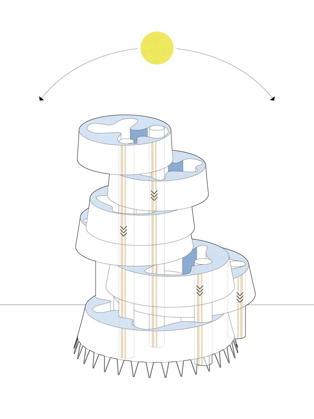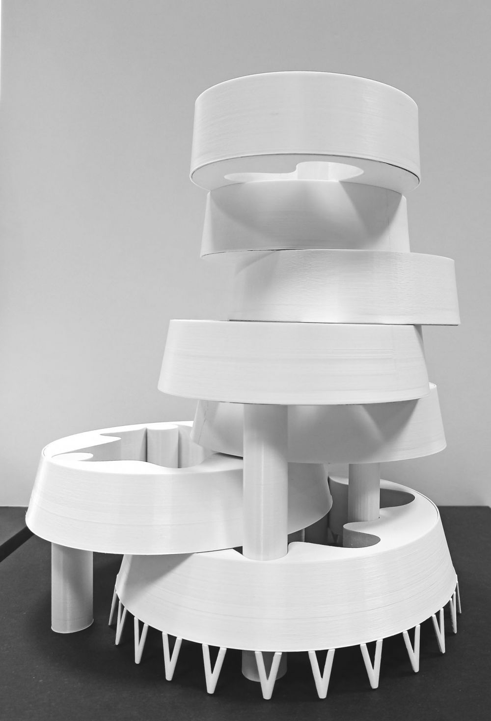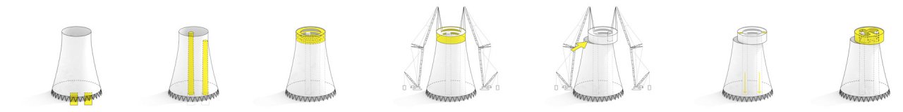 Mit Hoch 7 wird eine Utopie geschaffen, die eine vertikale Siedlung im Kühlturm ermöglicht und dort in sieben Ringen Wohnraum und ergänzende Bereiche für über 1700 Menschen bietet. Der Bestandsbau wird der Struktur der Betonierabschnitte im Turminneren folgend in Ringe zerschnitten und durch eine Freiform ergänzt, welche die geometrische Strenge des Kreises durchbricht.