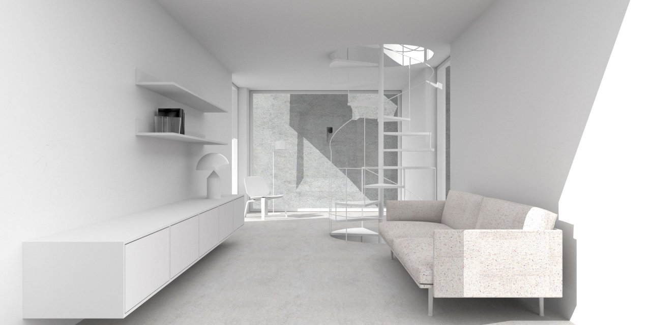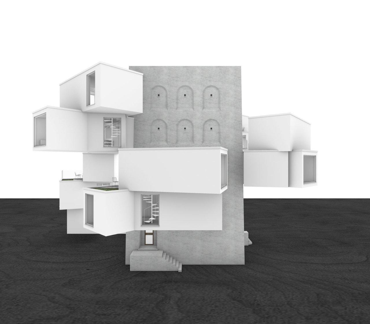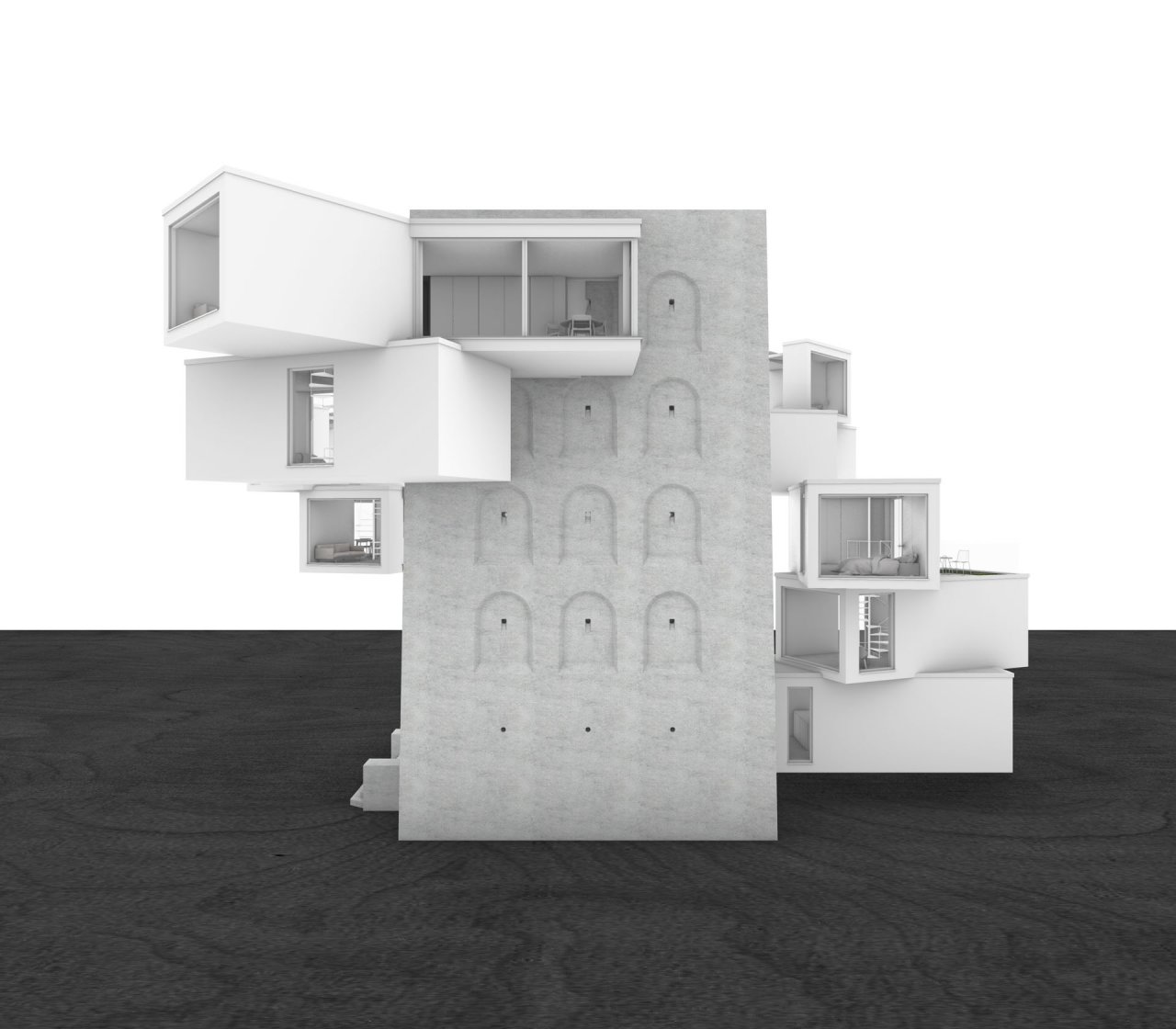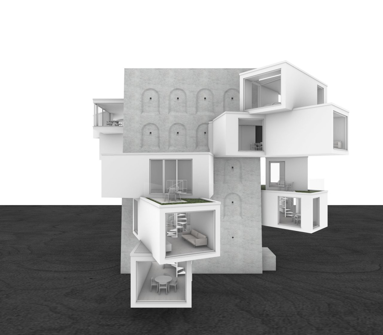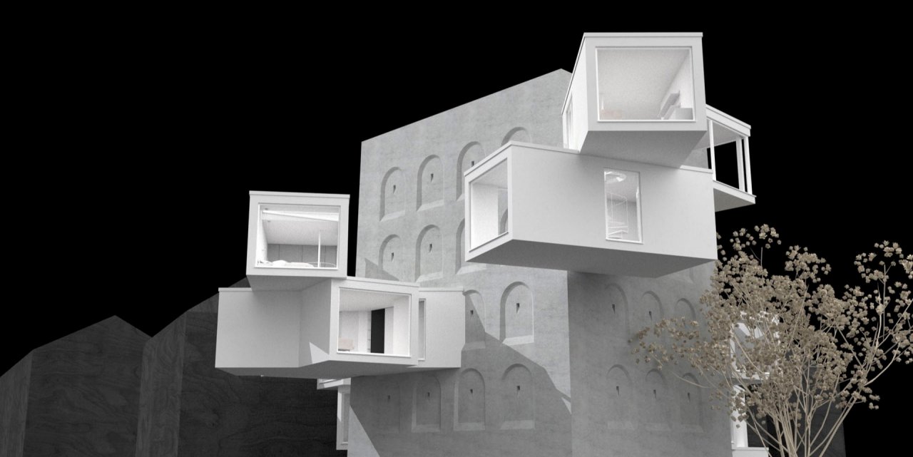 Dauerhaftes Wohnen nur in den vorhandenen Innenräumen ist jedoch nicht denkbar und so musste das Gebäude nach außen erweitert werden. Innerhalb der Wände sind Module mit Flur und Bad im 45-Grad-Winkel in dem entwickelten überdachten Innenhof errichtet worden. Die Durchbrüche durch die bestehenden Wände unterstreichen den Kontrast zwischen den dunklen und schweren Innenräumen und den hellen Außenräumen. Die Auskragungen sind in natürlichem Licht gebadet, einfarbig gehalten und bieten Ausblicke auf die Stadt und zurück zum Bunker. In den Auskragungen befinden sich die Küchen-, Wohn-, Ess- und Schlafbereiche.