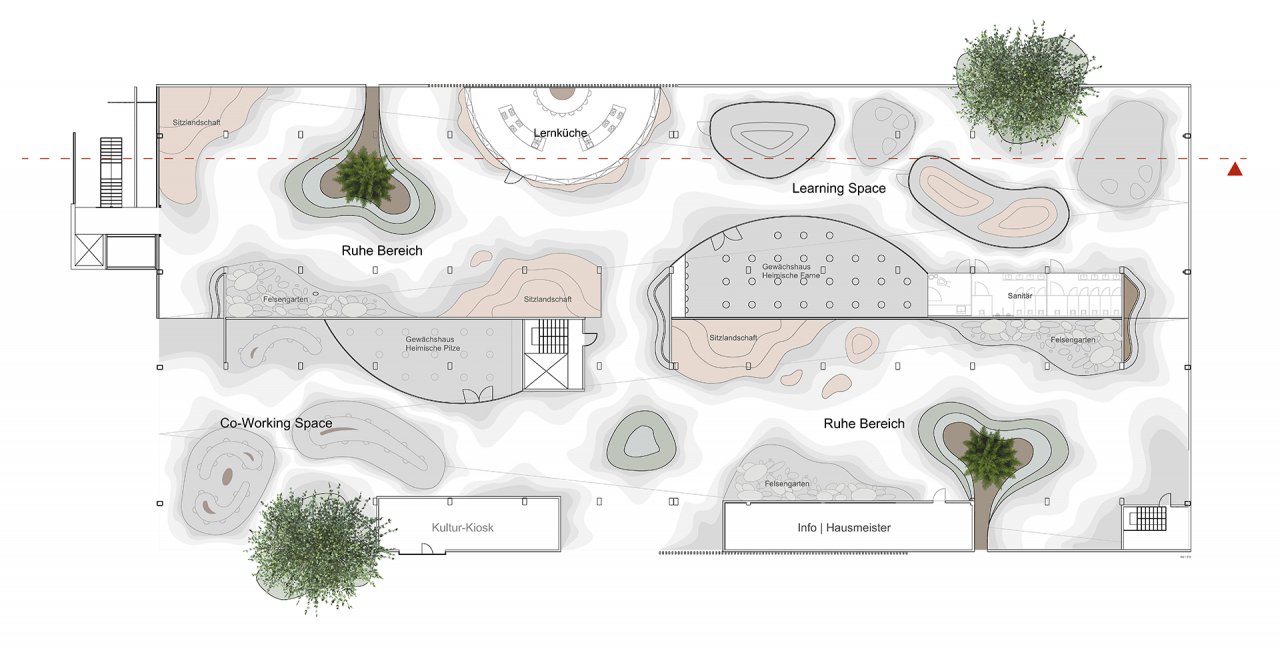 Ort des Austausches und der Begegnung; Gemeinschaftliche Hochbeete für Nutzpflanzen und Blüten-Pflanzen; Offene Co-Working Bereiche