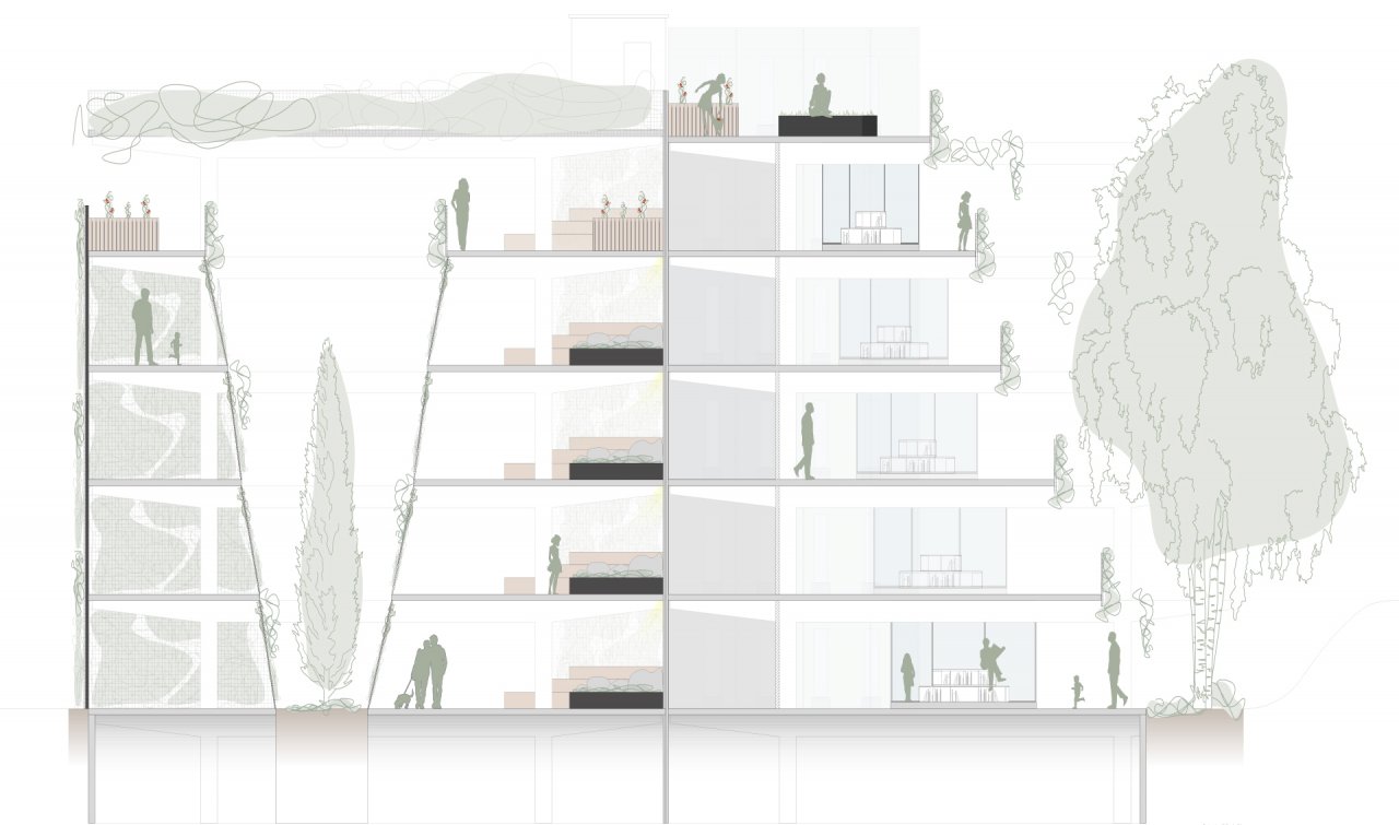 Growing Spaces ist ein vertikaler Stadtpark, der viele Möglichkeiten bietet, um von und mit der Natur zu lernen. Ein Ort, um gemeinsam einen näheren Kontakt mit der heimischen Natur zu erstreben. Das Parkhaus soll in der Umnutzung Lebensraum für Mensch, Natur und Tier werden, ohne dass eine Seite die andere verdrängt.