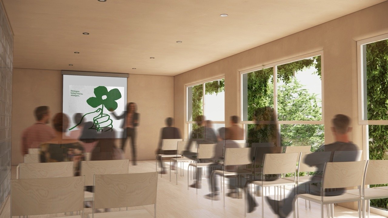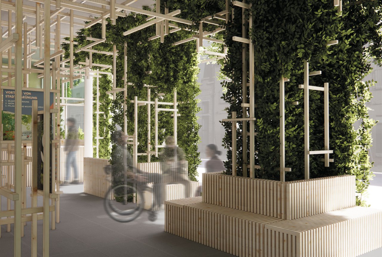 Nichts verbindet Menschen mehr als gemeinsames Handeln für Veränderung. Städte müssen sich in Zukunft dem Klimawandel und dem Mangel an Aufenthaltsflächen stellen. Mit dem Projekt „Im Grünen“ entstehen vertikale Freiräume in der Stadt. Ein Großteil des Gebäudes wird öffentlicher Stadtraum. Das Erdgeschoss zeigt wechselnde Ausstellungen zu grüner Stadtent-wicklung und Selbstwirksamkeit. Im Obergeschoss treffen sich Vereine und Initiativen, es gibt öffentliche Vorträge, Seminare und Bildungsveranstaltungen. Das Gebäude selbst ist ein Bei-spiel für grüne Stadtgestaltung und bietet Beratung für Begrünungsprojekte. Das gesamtheit-liche Umdenken unserer Gesellschaft ist entscheidend. Dieser Ort soll dazu beitragen, dass Politik und Stadtgesellschaft gemeinsam die Zukunft der Stadt entwickeln.