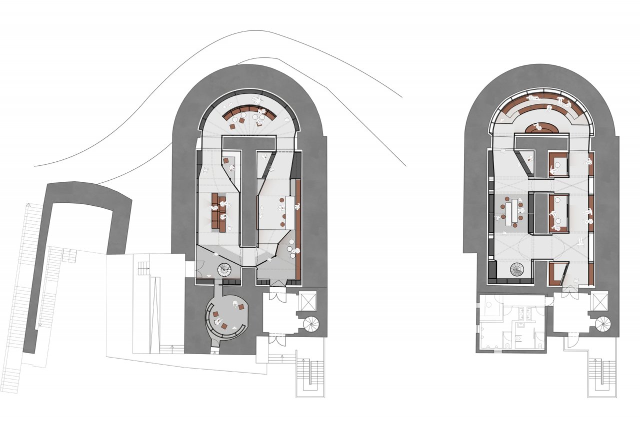 Räumlich werden die Gewölbekeller durch eine selbsttragende Holzkonstruktion geprägt, die sich wie eine zweite Haut einfügt. Halbtransparente Gaze bespannt die Struktur, kontrastiert optisch mit den rauen und kalten Oberflächen des Bestands und wird mit erzählenden Projektionen bespielt.
