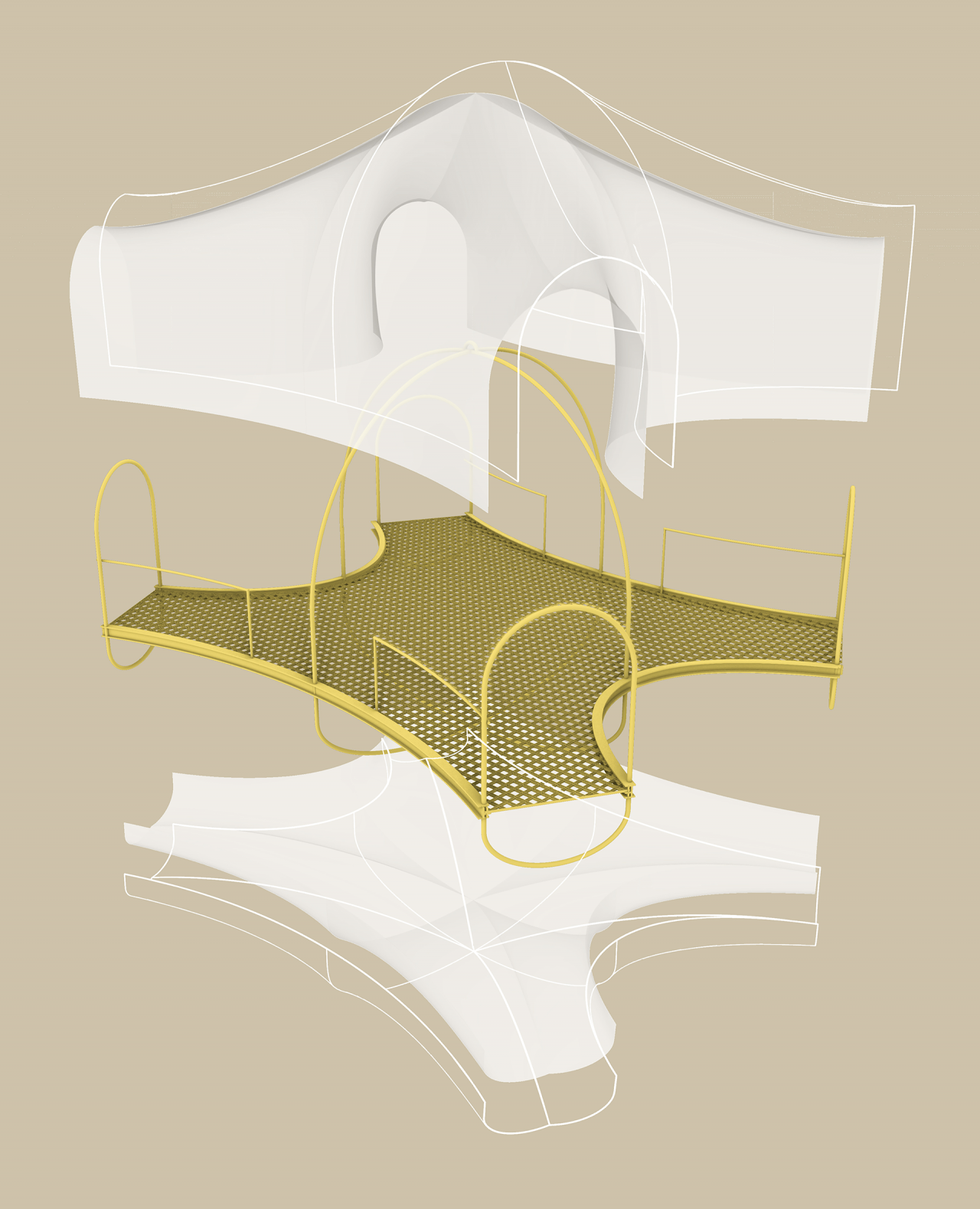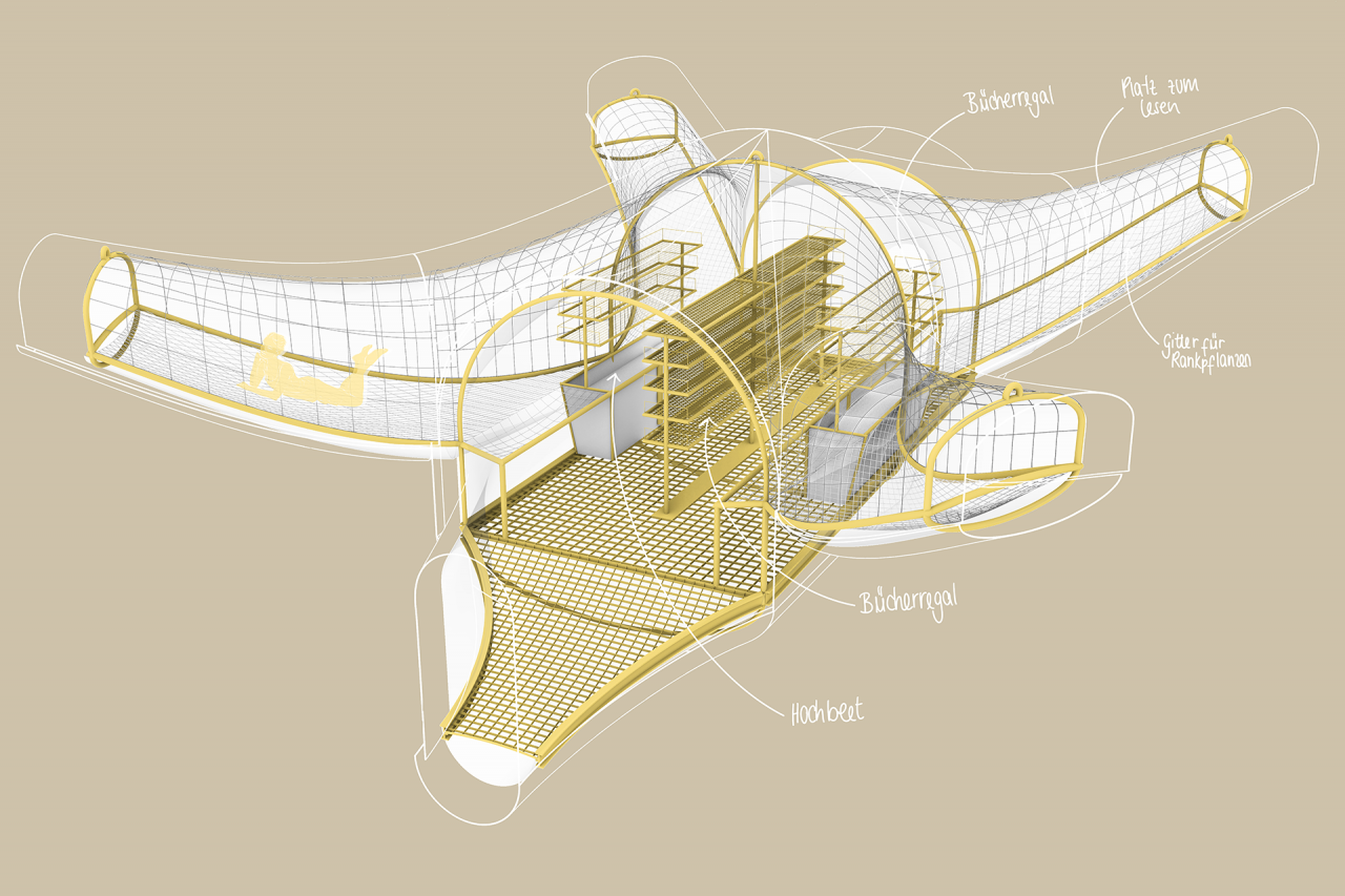 Inspiriert von der Installation „Tape“ des Numen/For Use Design Collective, kombiniert die Studentin den Gedanken eines begehbaren Spinnennetzes mit funktionalen Elementen. Die Installation, ausschließlich über die Treppenhäuser für die Bewohner*innen zugänglich, integriert Module wie Wege, Gemeinschafts- und Aktivitätsbereiche. Das Gemeinschaftsmodul fungiert als Knotenpunkt für soziale Interaktionen, wie Gemeinschaftshochbeete und ein Barbecue, während das Aktivitätsmodul Raum für Tauschbücherei, Fitness und Kino bietet.