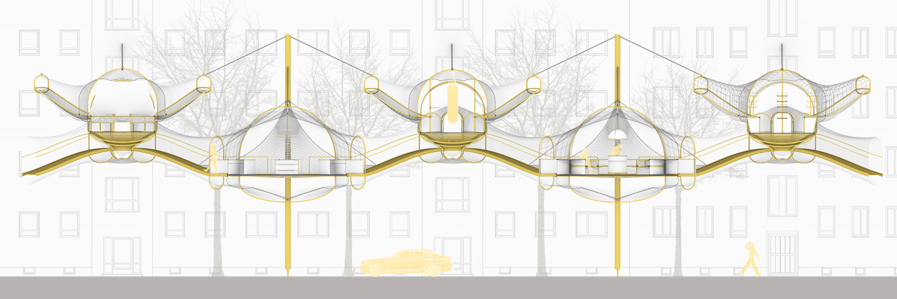 Das Projekt „Zusammen Abhängen“ macht den Luftraum zwischen zwei Häusern der tristen Wohnviertel Berlins erlebbar. Zugleich wird dieser durch zusätzliche Freizeitmöglichkeiten, Gemeinschaftsräume und Begrünung attraktiver gestaltet. Die Architektur, inspiriert von der Idee des Vernetzens und gemeinsamen Erlebens, setzt auf eine zwischen den Häusern eingehängte Konstruktion aus Netzen, Stahl und Seilen.