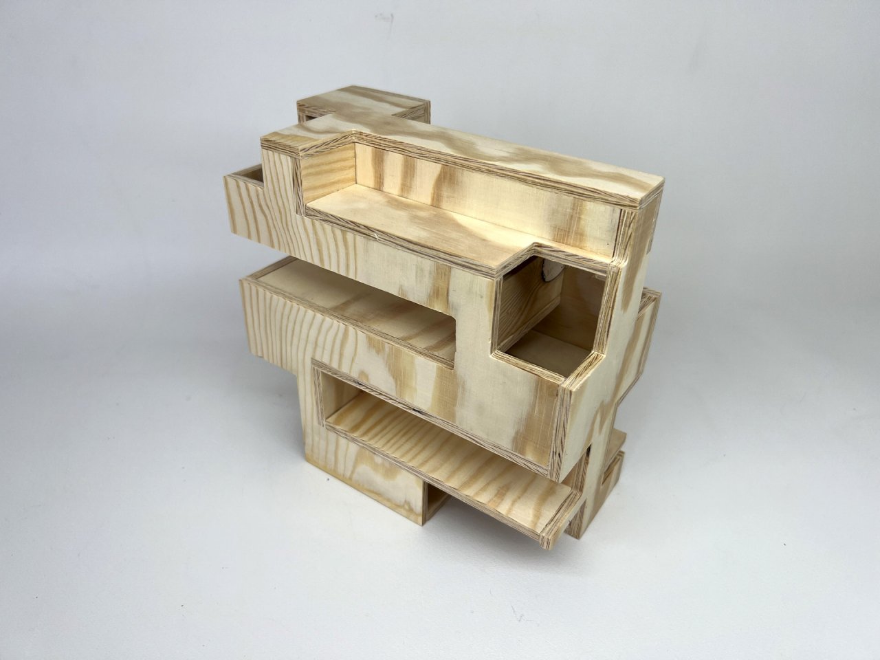 Die Studierenden erlernen in der Übung „Alphabet : Planar“ das Entwerfen von dreidimensionalen Objekten mit planaren und orthogonal gefügten Flächen mit Hilfe von Extrusion und boolscher Rechenoperationen auf Basis ihrer Initialen. Für die Überführung in die Digitale Fertigung erstellen sie komplexe Fügungen mit Materialdimension und eine Abwicklung mit Hilfe der parametrischen Software Grasshopper/Biber. Nach einer Einführung in die digitale Handfräse Shapertool können die Studierenden ihre Projekte eigenständig in Holz produzieren und montieren.