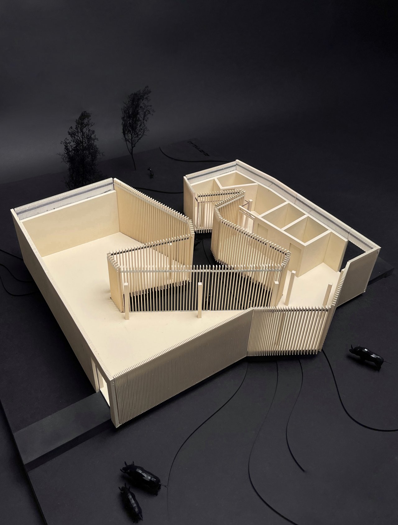 Das Innengehege ist dabei der Hauptgestaltungsimpuls. Es ragt in das Gebäude hinein und stört den rechteckigen, linearen Baukörper. Es schneidet Räume und Wege des Gebäudes und gestaltet so den Grundriss mit. Tiere haben so die Möglichkeit, in alle Räume zu gehen und selbstständig den Kontakt zu Menschen zu suchen oder sich diesem auch zu entziehen.