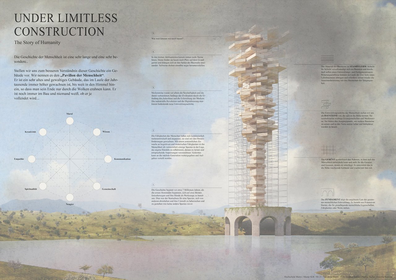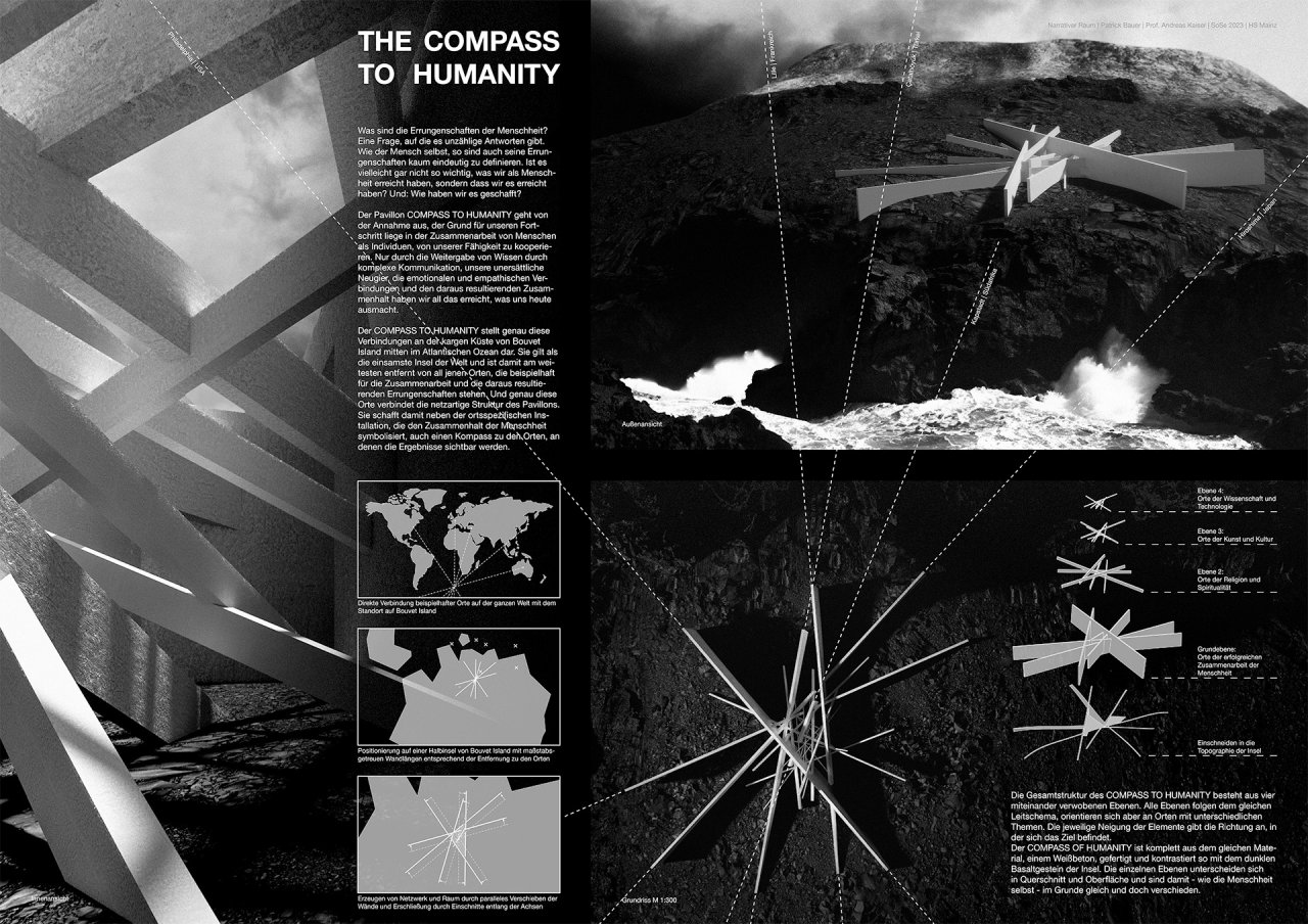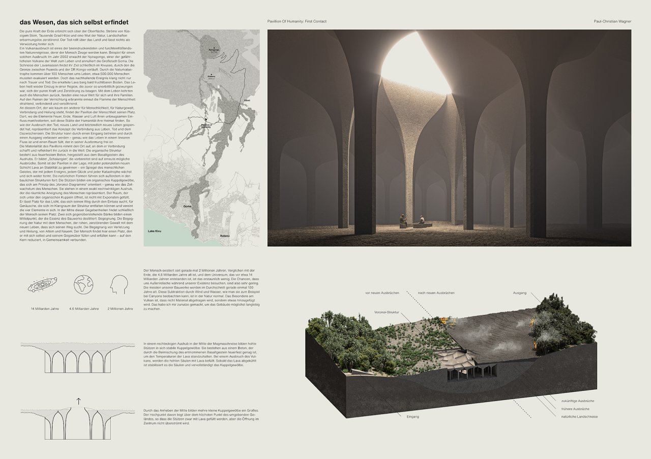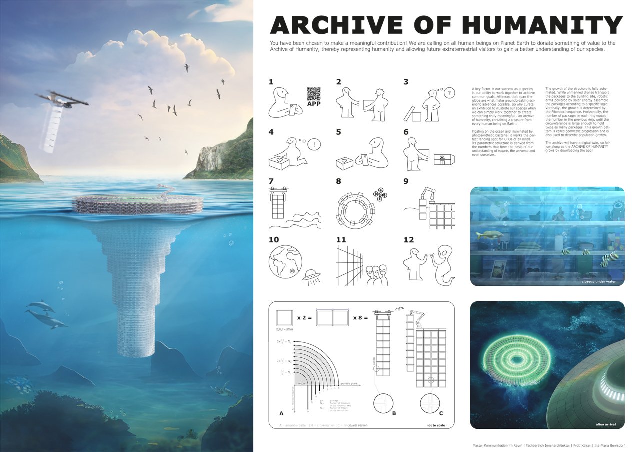 Der Pavillon der Menschheit: First Contact war ein Architekturwettbewerb, bei dem eine Struktur entworfen werden sollte, in der die besten und klügsten Errungenschaften unserer Spezies so untergebracht sind, dass sie - sollten wir jemals von anderen Lebensformen besucht werden - sich in einem einzigen oder mehreren Räumen über das, was die Menschheit ausmacht, informieren können. Dass es unmöglich ist, alle Errungenschaften der Welt in einem Bauwerk zu zeigen, war uns schnell klar. So haben wir versucht, dieses Wissen in der Struktur abzubilden, die entworfen werden sollte.