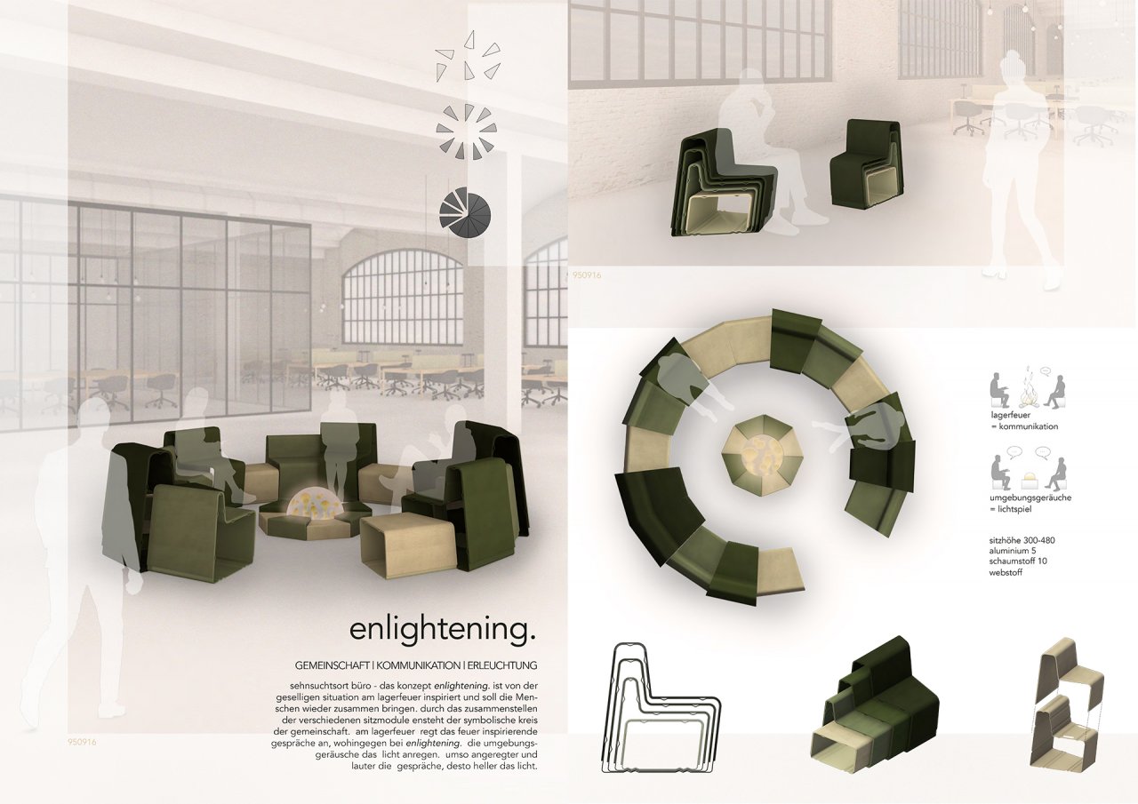 Durch das Zusammenstellen der verschiedenen, in einander schiebbaren Sitzmodule entsteht der symbolische Kreis der Gemeinschaft. Am Lagerfeuer regt die Flamme inspirierende Gespräche an. Bei „enlightening“ ist es genau umgekehrt. Die Umgebungsgeräusche triggern und steuern über einen Akustiksensor das Licht in der zentralen Leuchte. Je angeregter und lauter die Gespräche, desto heller und lebhafter das „Feuer-Licht“.