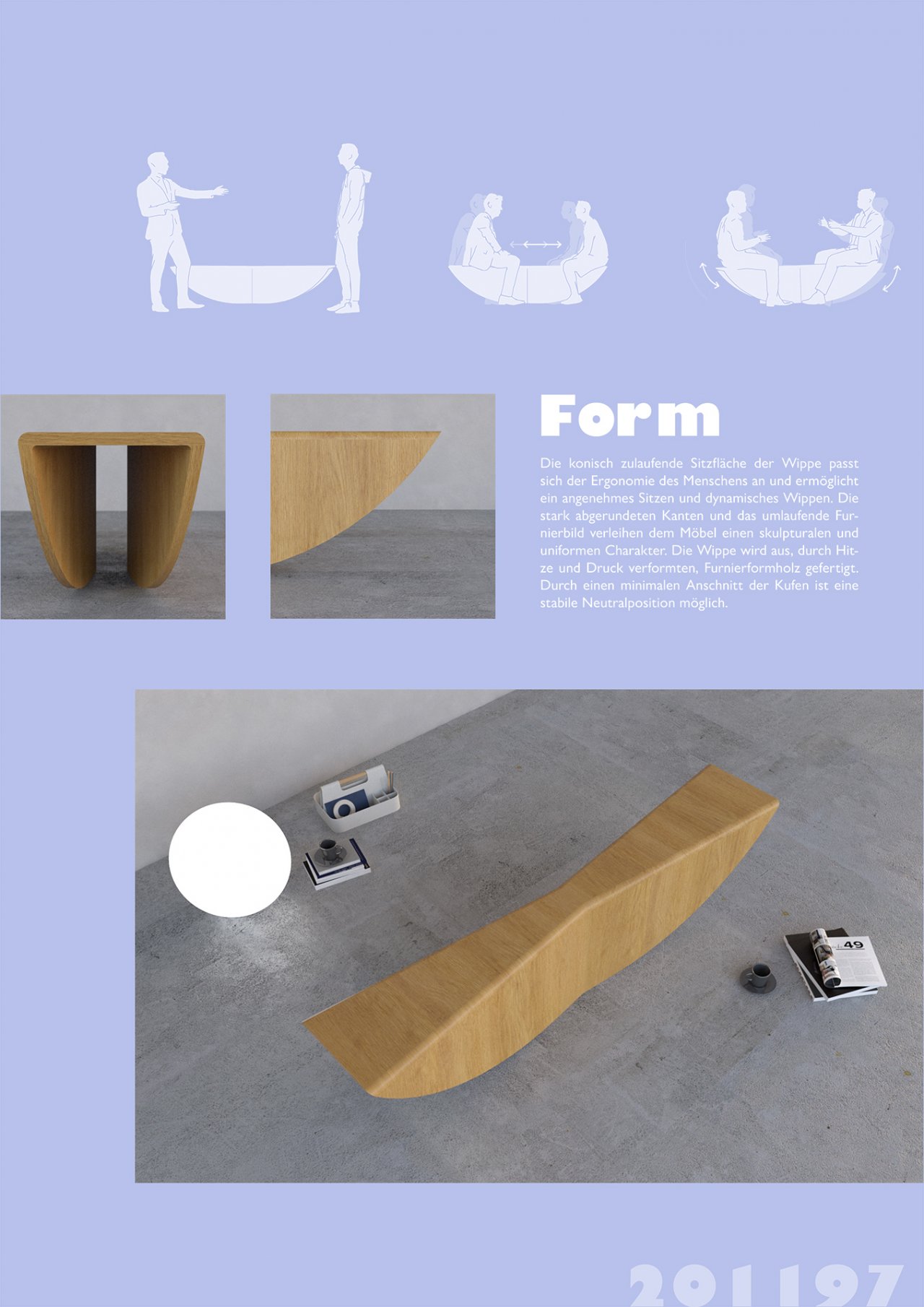 Die konisch zulaufende Sitzfläche der Wippe passt sich der Ergonomie des Menschens an und ermöglicht ein angenehmes Sitzen und dynamisches Wippen. Die stark abgerundeten Kanten und das umlaufende Furnierbild verleihen dem Möbel einen skulpturalen und uniformen Charakter. Die Wippe wird aus, durch Hitze und Druck verformten, Furnierformholz gefertigt. Durch einen minimalen Anschnitt der Kufen ist eine stabile Neutralposition möglich.