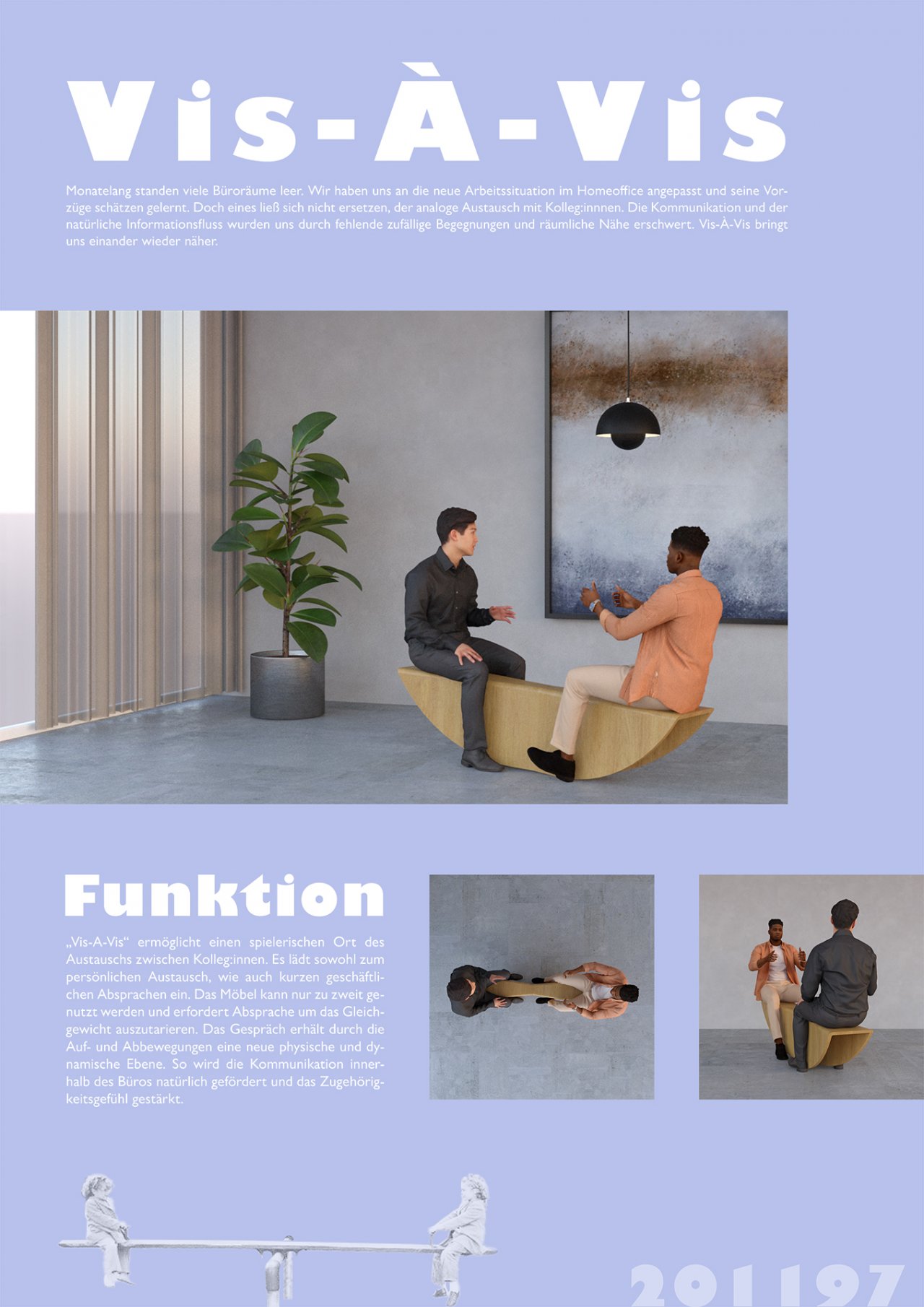 „Vis-A-Vis“ ermöglicht einen spielerischen Ort des Austauschs zwischen Kolleg:innen. Es lädt sowohl zum persönlichen Austausch, wie auch kurzen geschäftlichen Absprachen ein. Das Möbel kann nur zu zweit genutzt werden und erfordert Absprache um das Gleichgewicht auszutarieren. Das Gespräch erhält durch die Auf- und Abbewegungen eine neue physische und dynamische Ebene. So wird die Kommunikation innerhalb des Büros natürlich gefördert und das Zugehörigkeitsgefühl gestärkt.