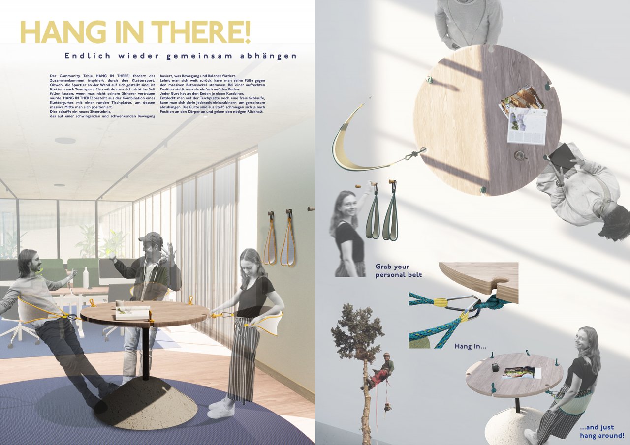 Der Community Table HANG IN THERE! fördert das Zusammenkommen inspiriert durch den Klettersport. Obwohl die Sportler an der Wand auf sich gestellt sind, ist Klettern auch Teamsport. Man würde man sich nicht ins Seil fallen lassen, wenn man nicht seinem Sicherer vertrauen würde. HANG IN THERE! besteht aus der Kombination eines Klettergurtes mit einer runden Tischplatte, um dessen massive Mitte man sich positioniert.