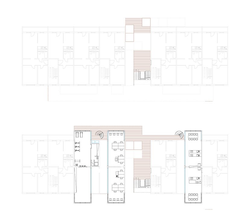 Die öffentlichen Bereiche bestehen aus einer Kita, einem Sportraum, Büroräumen, öffentlich nutzbaren Küchen und einem Leseraum über dem direkt der Veranstaltungsraum anschließt.
