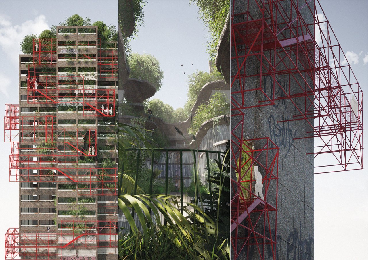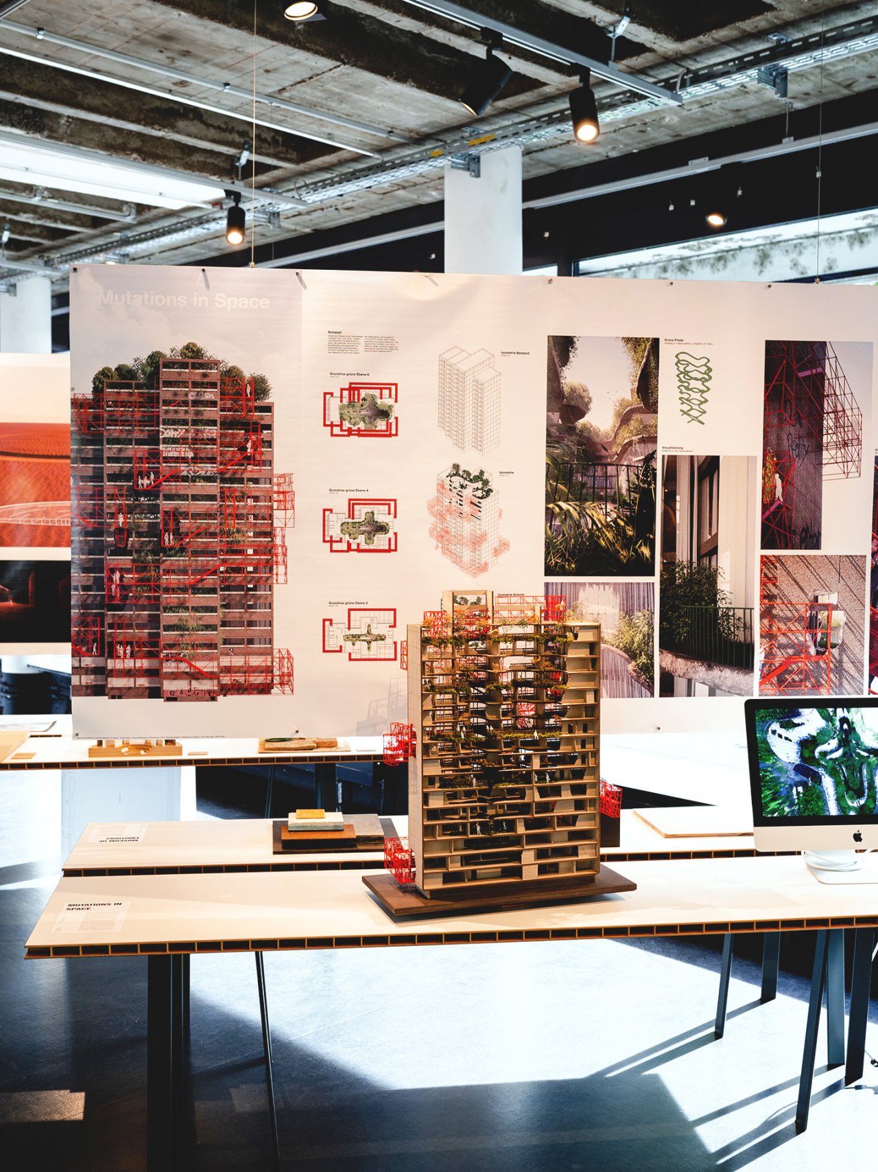 Mutations in Space ist ein Wechselspiel von Natur zwischen Innen- und Außen-, Negativund Positivraum. Es befindet sich in einem leer stehenden Wohnhochhaus. Es beherbergt zwei gegensätzliche Raumerlebnisse, die abwechselnd auf einem ansteigenden Pfad durch das Gebäude durchschritten werden. Der Gebäudekern wird ausgehöhlt und schafft im Inneren einen hohen, begrünten und ruhigen Positivraum. Der negative Raum entsteht durch einen Befall von außen. Auf einer luftigen und bedrohlichen Gerüststruktur begeht der Besucher einen negativen Raum.