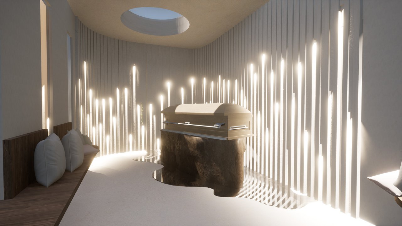 Um die Neugestaltung des Mainzer Krematoriums in einem angemessenen und atmosphärischen Rahmen umzusetzen, hat sich unser Team unter der Betrachtung und der Bedeutung von Himmel und Licht, dem Objekt angenähert. So spielt bei uns die Verwendung von Licht (sowohl in natürlicher, als auch in künstlicher Form) eine besonders wichtige Rolle. Gemeinsam haben wir ein Konzept entwickelt, welches im Krematorium sowohl eine wohltuende und entspannte Arbeitsumgebung erzeugen soll, zugleich aber die Trauernden in einer einladenden