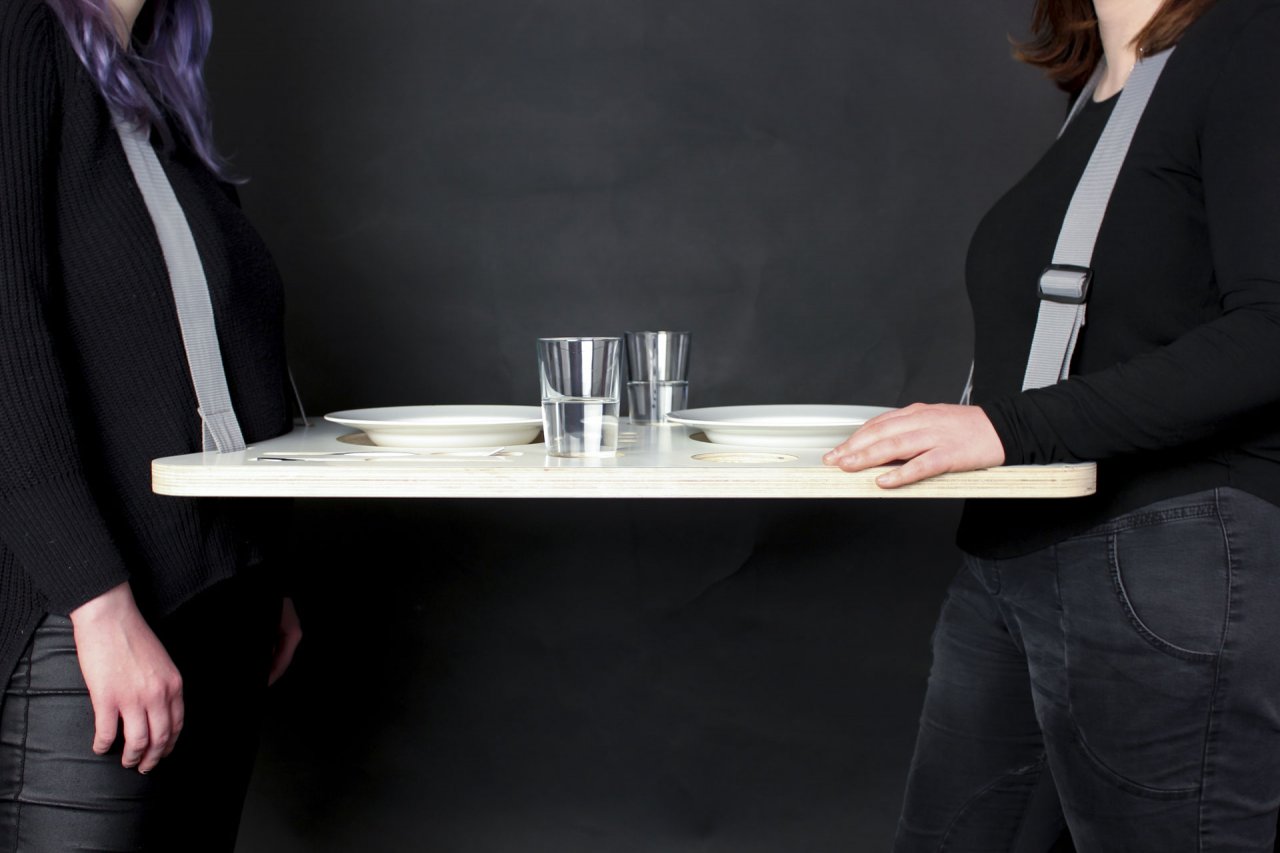 Hier kommt der TAKE AWAY TABLE zum Einsatz. Das Möbel funktioniert dabei wie ein Bauchladen – allerdings braucht es zwingend ein Gegenüber. Somit ist das improvisierte Essen im Stehen auch immer mit einer zweiten Person verbunden – entweder man ist zu zweit oder lernt jemand neues kennen – sonst funktioniert es nicht! Beide legen sich die, je nach Körpergröße verstellbaren Gurte um und können ihr Essen gemeinsam genießen.