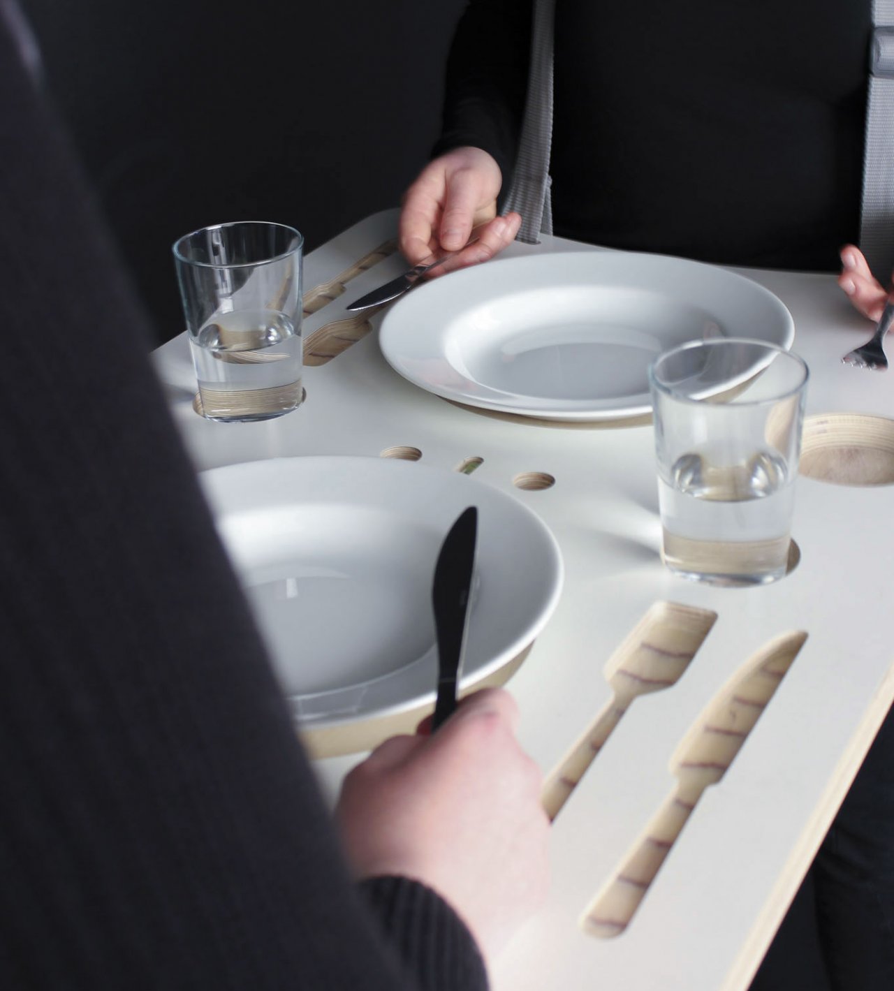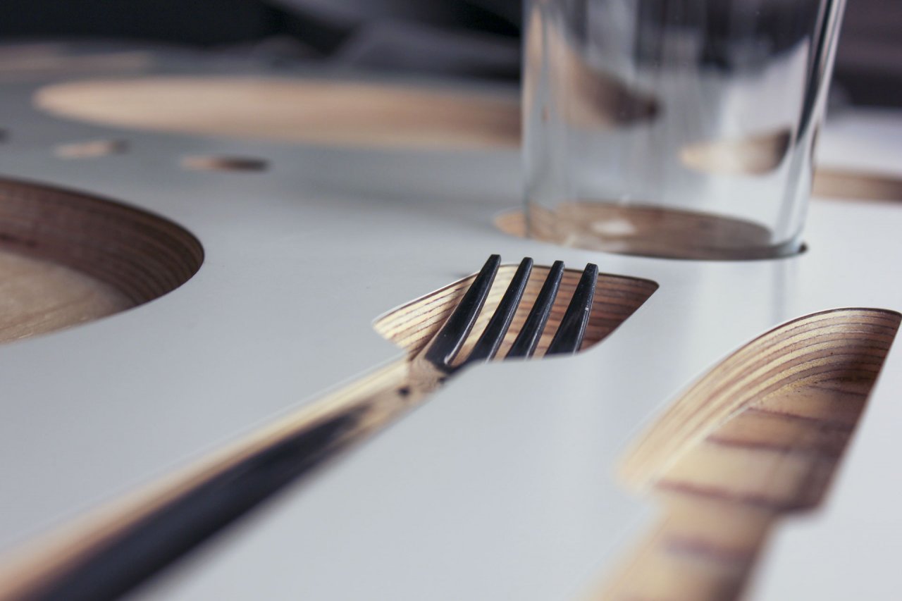 Der TAKE AWAY TABLE besteht aus einer 24mm Multiplex Birkenholz Platte mit hellem Furnier. Ausgefräste Vertiefungen bilden passgenaue Halterungen für Geschirr, Besteck und sogar einer eingebauten Wasserwaage. Guten Appetit!