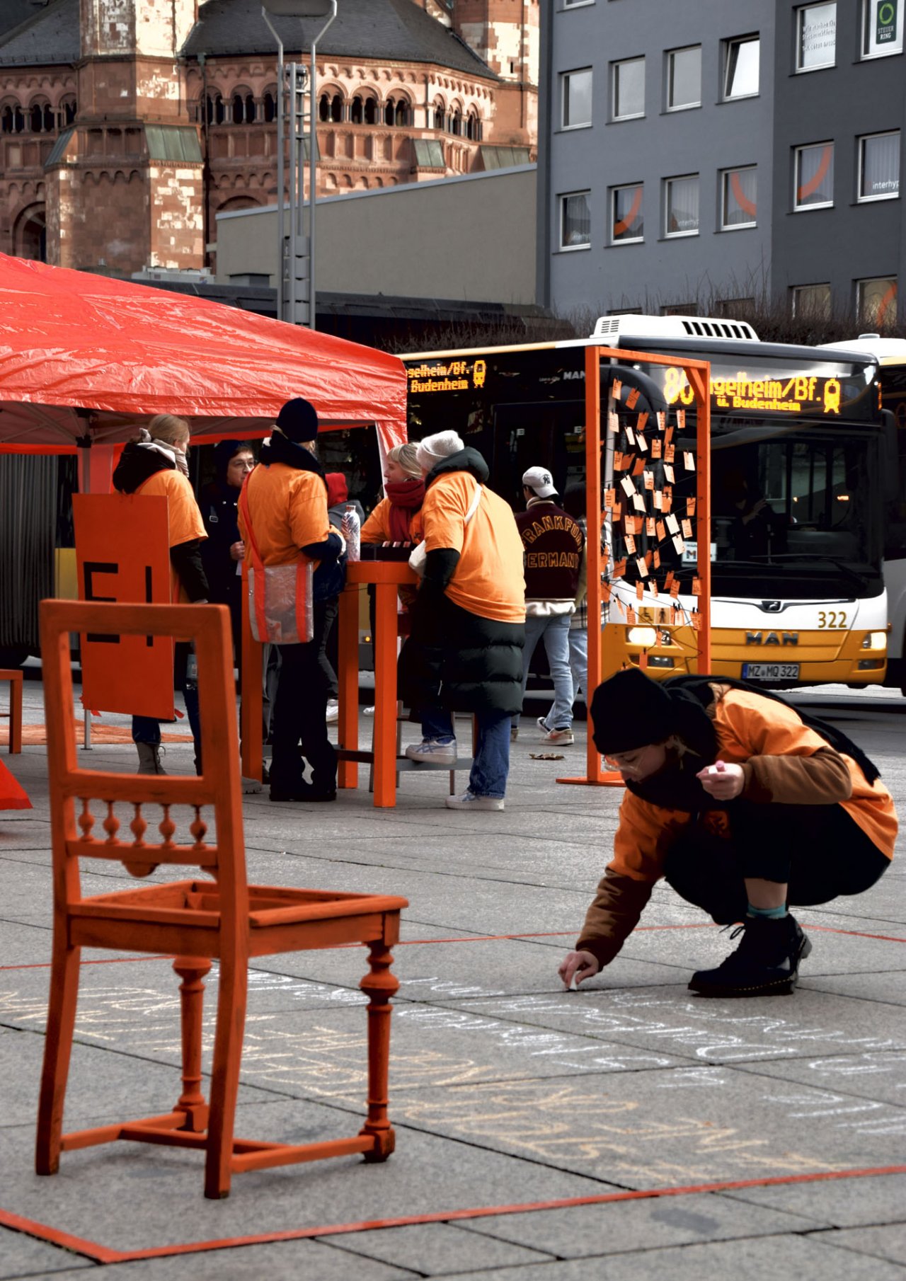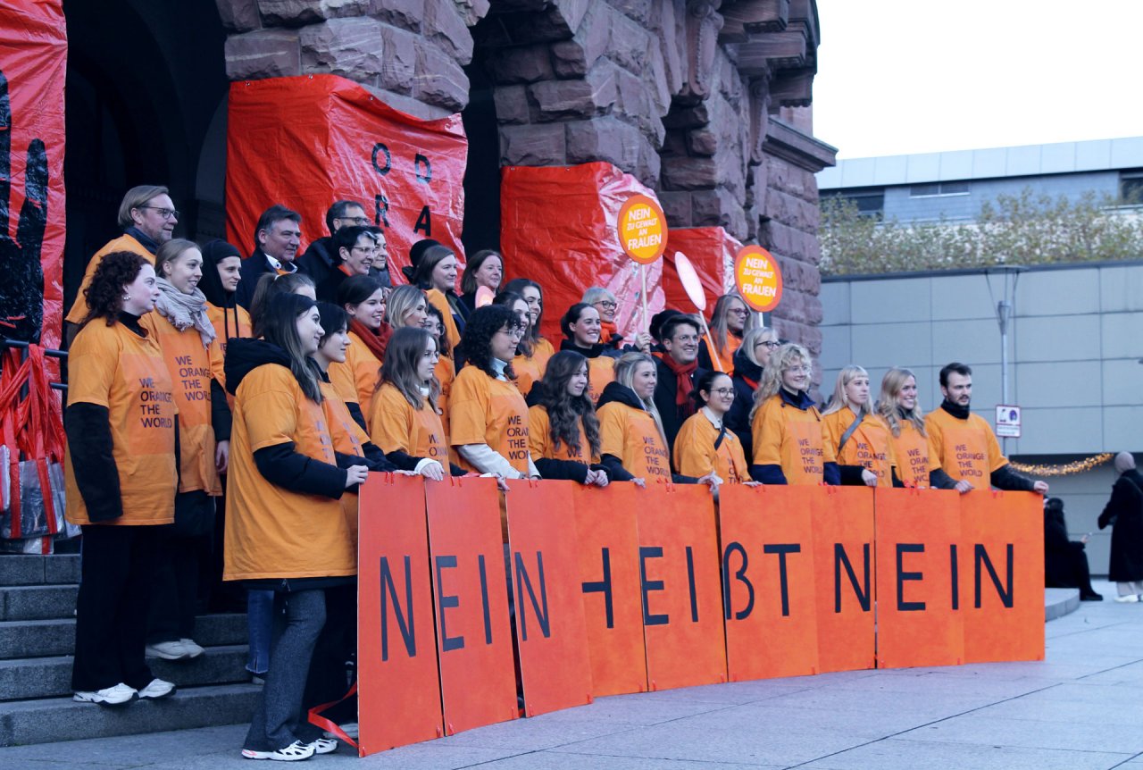 Das WE ORANGE THE WORLD-Team hat in kurzer Zeit ein äußerst strahlkräftiges Projekt auf die Beine gestellt. Die riesigen Fassadenbanner am LUX, Staats- theater Mainz , Haus des Erinnerns und Hochschulstandort Holzstraße machten für 16 Tage das Thema STOPPT GEWALT GEGEN FRAUEN - JETZT! weithin sichtbar. Die künstlerisch-szenografischen Interventionen und Gespräche auf dem Gutenbergplatz erhöhten zusätzlich die Aufmerksamkeit im öffentlichen Raum.